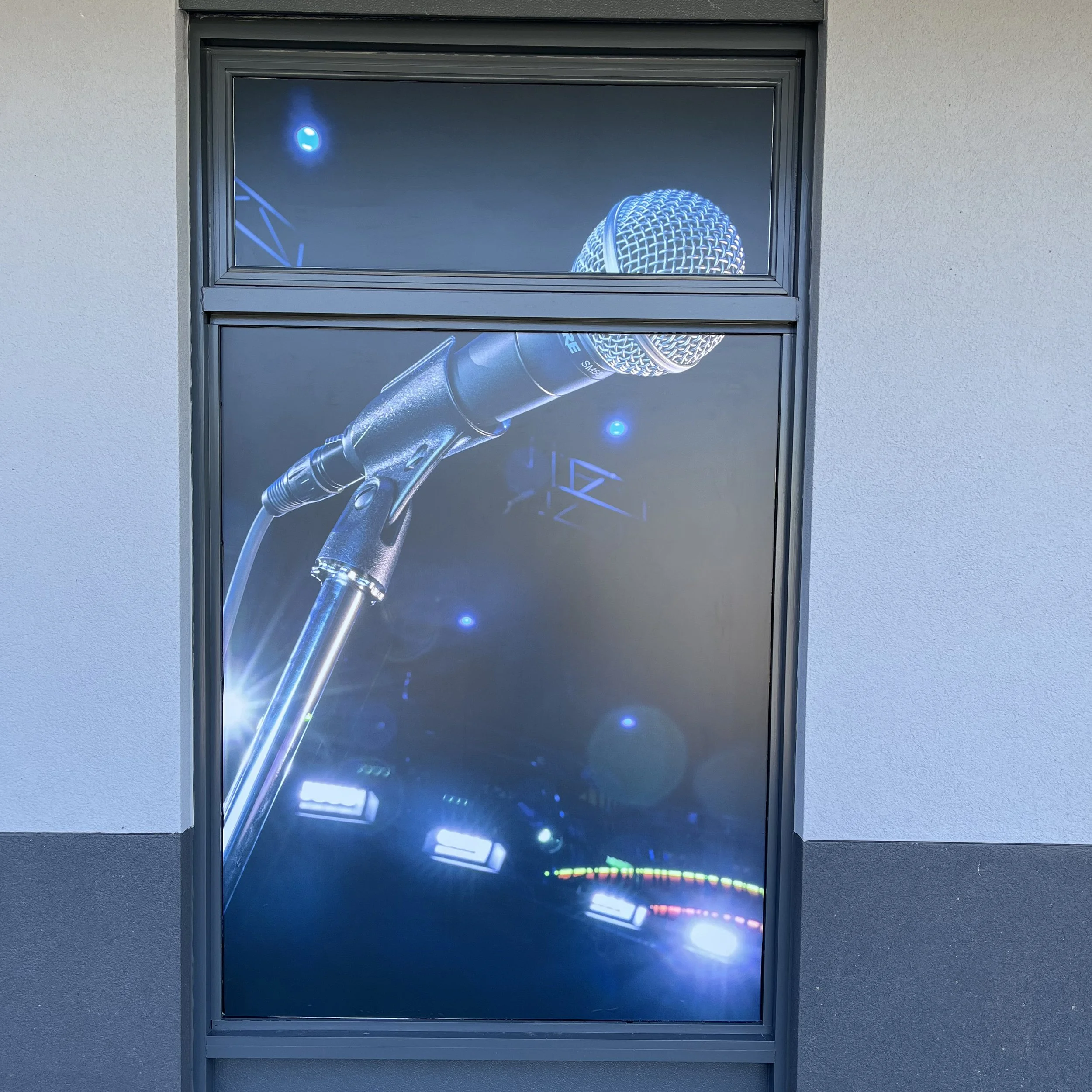 The second option is the Perforated window vinyl. This option allows for the image to be printed on the front surface but the vinyl, itself, is perforated with a 50/50 mix (or 70/30 mix) of printed surface area to holes that allows the vinyl to be applied over the glass and still be able to see through the window. It should be noted that it is easier to see out during the day, but at night, you can still see inside. If you want to block out whatever is behind the glass, opaque vinyl or frosted is the way to go.